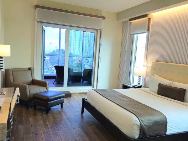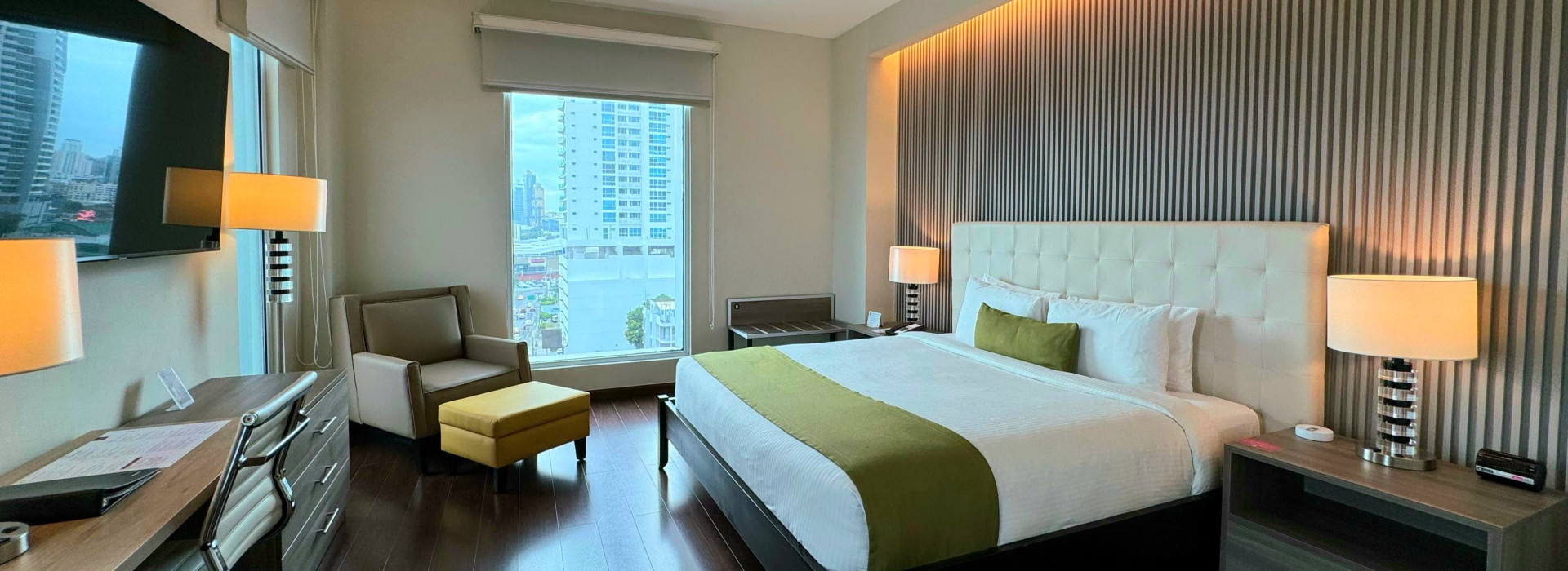 Al llegar la tarde, nuestras habitaciones Cama King Deluxe le garantizan que sentirá la ciudad latir, mientras se relaja con la vista panorámica del Océano Pacifico y los rascacielos dela Ciudad.